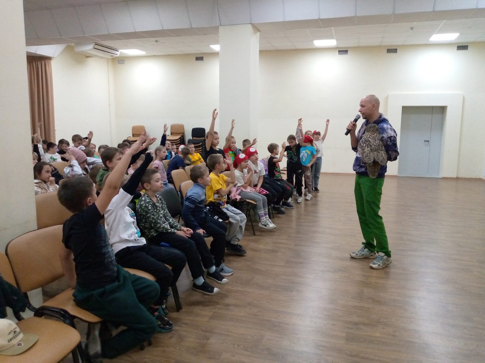 ветеринарный врач Антон Сергеевич Моднов, специалист по работе с дикими видами животных и птиц. Он приехал со своими питомцами - филином Бубликом и серой Неясытью Эгиль. Антон Сергеевич рассказал ребятам о своей работе, показал фото и видео презентации.